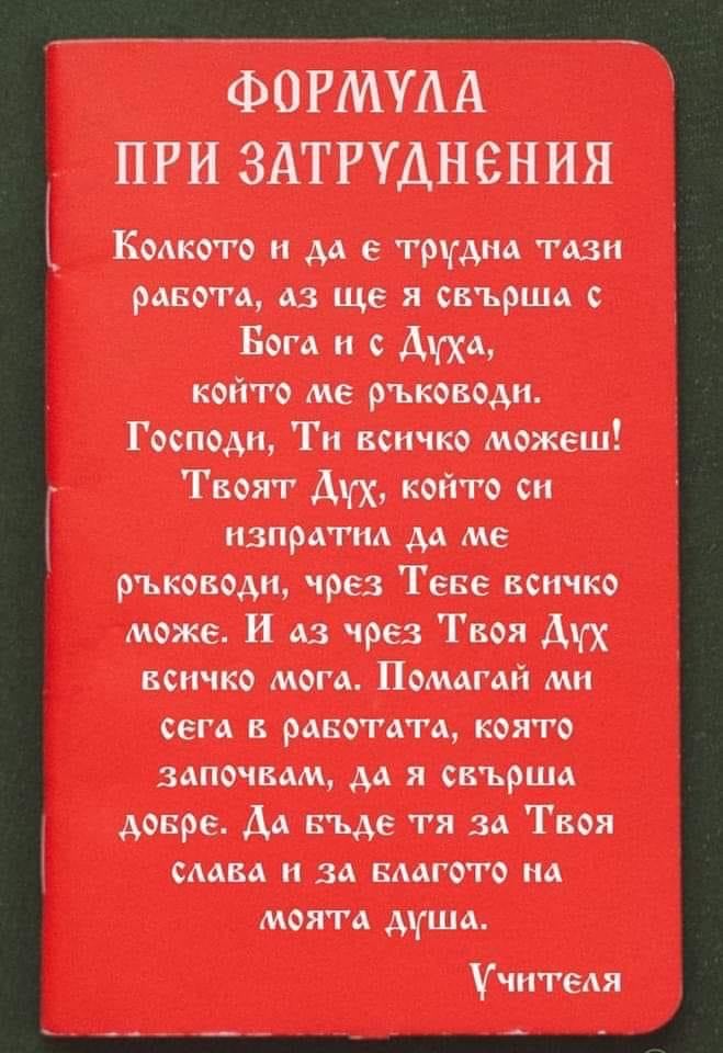 „Бог живее в тебе, Бог живее в мене. Мисли по Бога и говори с Бога в мене.“ (три пъти)