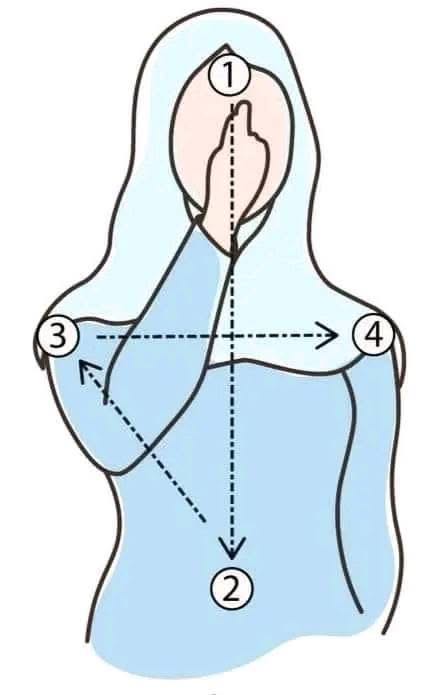 Пръстите на ръцете допрени пред устата с длани навън. В това положение се произнася: