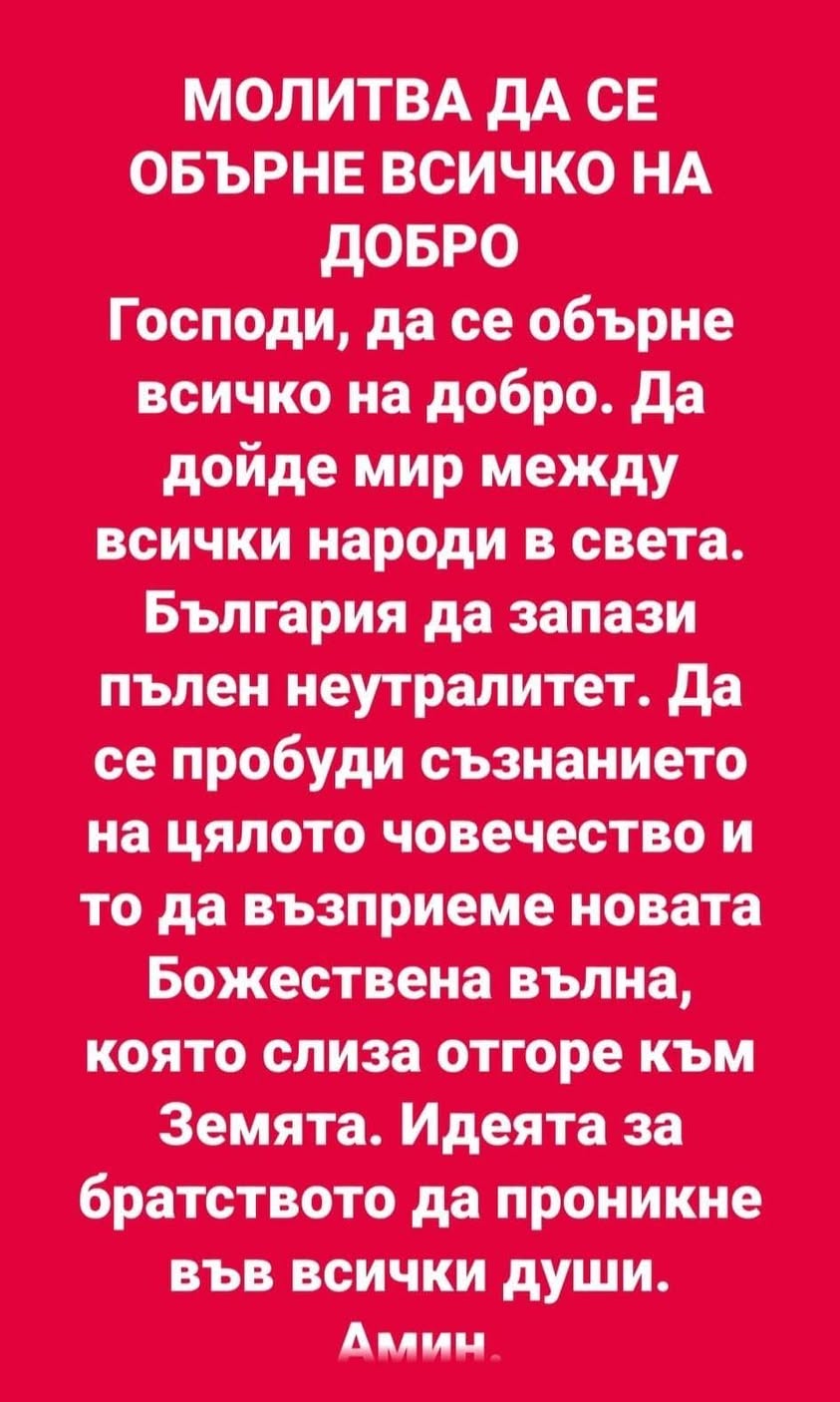 „Да се разпръснат всички лоши мисли на хората, които се противят на идването на Царството Божие. Да се въдвори Царството Божие и Неговата Правда да дойде на Земята.“