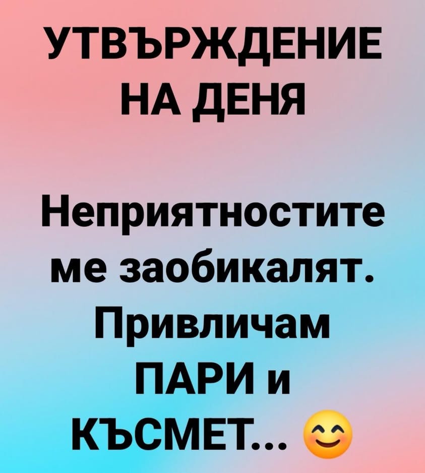 Когато си легнеш вечер си кажи тези слова Когато се събудиш пак си ги кажи Когато получиш пари пак си го кажи и ще получиш още повече Когато има нещо неясно пак си ги кажи Дните ще ни станат по хубави и спокойни
