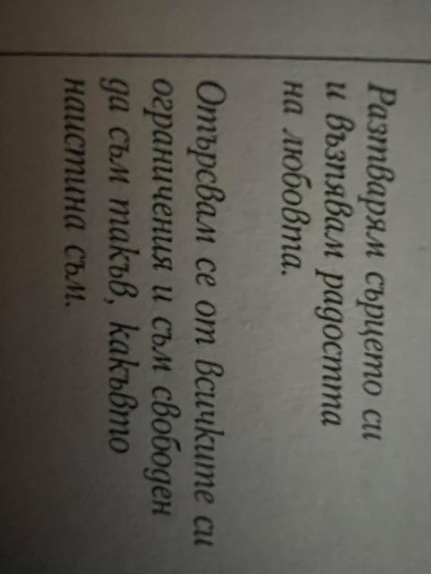 Например: Безусловната любов на Твореца в мен пречиства, лекува и възражда тялото и душата. Слушам сърцето, избирам, прощавам и продължавам напред с любов към себе си и живота.