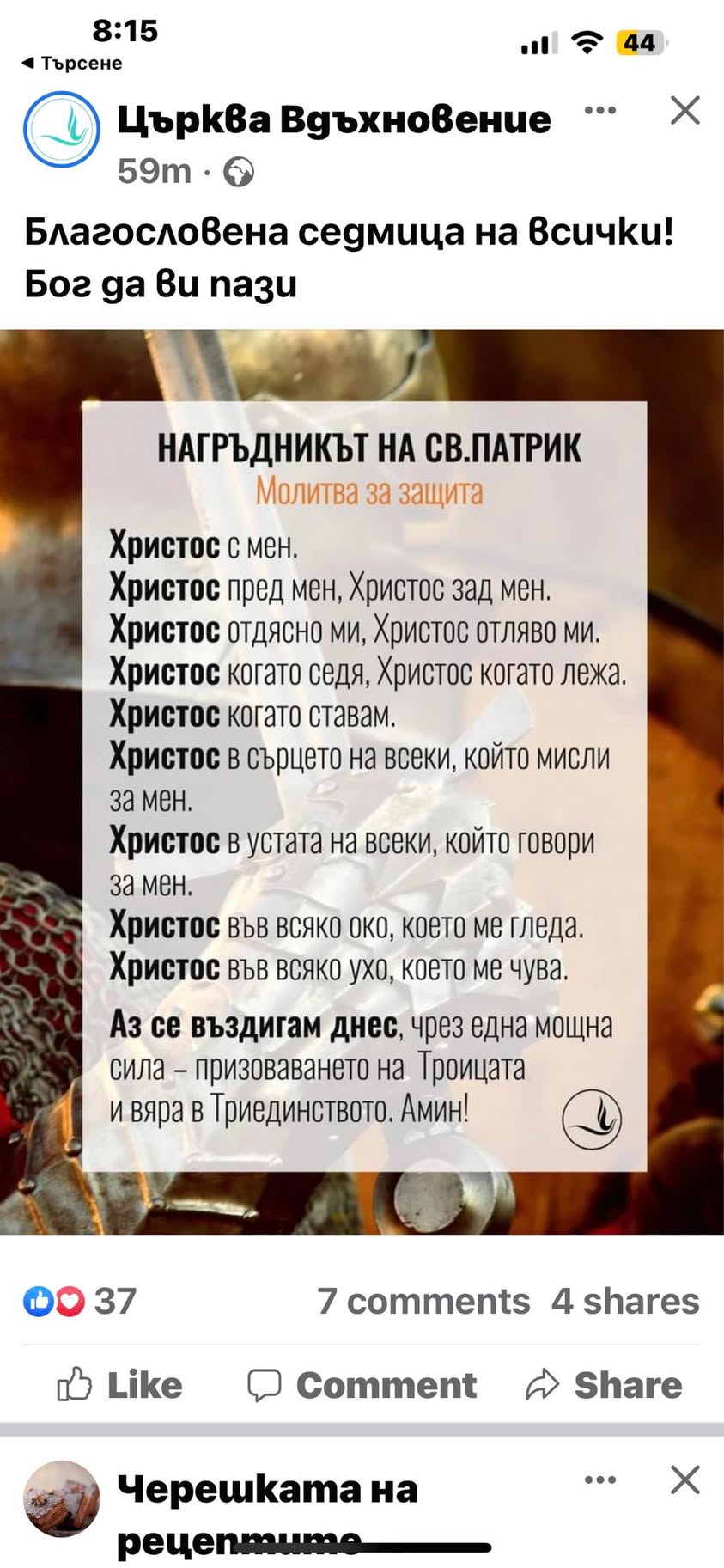 „Господи, разпръсни всички лъжи, замисли, мисли и планове на тъмните сили. Разбий козните им, да потънат в Земята и да се разтопят във водата.“ (накрая с духане)